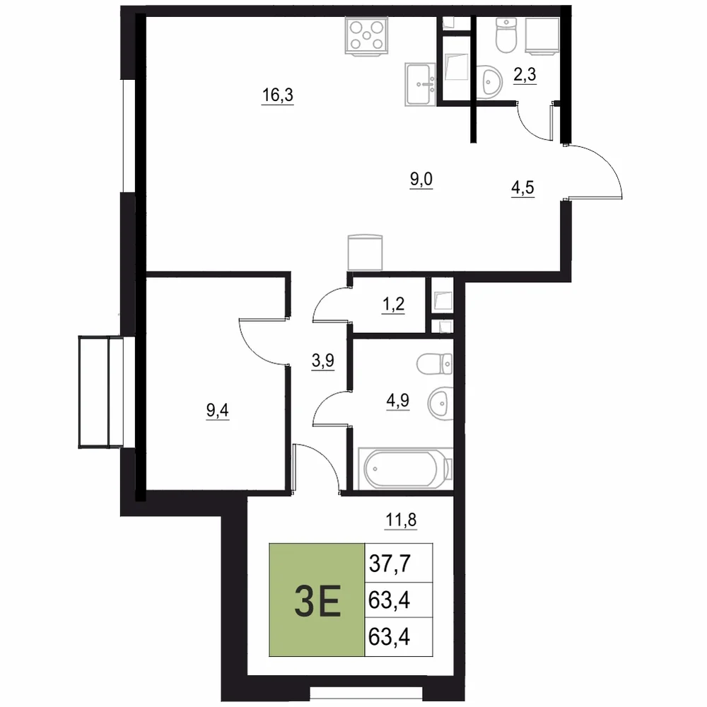 3-комнатная  59.5 м2